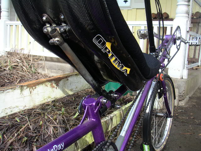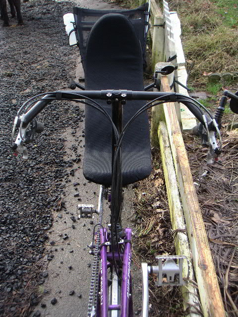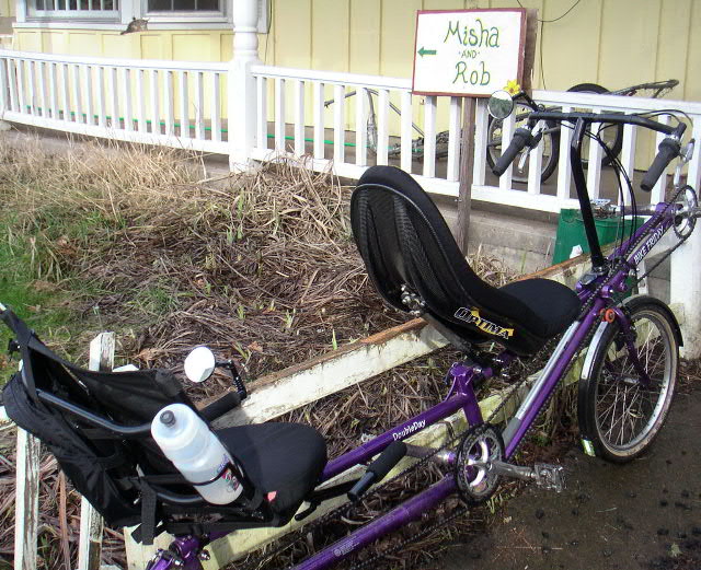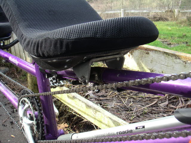History: Misha and I have enjoyed riding our Bike Friday TiLite tandem, but Misha has trouble with her neck and thus has also struggled a little with being comfortable. So I pulled down an early DoubleDay recumbent tandem prototype from the rafters at work, spruced it up somewhat, and we have been enjoying riding it - with Misha very happy on the back - since. The stoker position is basically stock, but to get myself comfortable on the front took a bit of work. First I turned the toptube clamp over, effectively lowering the top tube by a few inches, and thus enabling a lower seat height (and correspondingly maximising the seat to crank distance). Then I fabricated new mounts to enable me to mount an Optima carbon seat in place of the stock Bike Friday mesh version - I have always gotten on well with a rigid seat. Originally the bike had underseat steering, but not only do I not like this position, but there was play in the linkage that made steering somewhat of a challenge! I ended up using the same bars, mounted upside down in a regular Bike Friday stem; this keeps my arms in my prefered stretched out position and just gives room for my knees under the bar. The bike is still a bit twitchy on low speed climbs, but I am getting better at holding it steady. I put fenders on the bike, but it turned out that at speed spray would come off the front wheel, over the crank and up to hit me in the face! An additional fender on the front of the fork took care of this. Purpose: Comfortable tandem cruising with my honey!