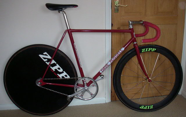 History: This is my second track frame. The first was a second hand Langdale, which was a bit too big for me, and got damaged when my drive chain self destructed whilst racing a points race at Manchester. Dave was built for a friend of mine who only used it once or twice - I bought the frameset from her in (I think) 1998. It is a lovely stiff lugged-and-brazed 753 frame that I used for hillclimbs a few times, and for a lot of track racing, mostly at Reading. New this year is the rear disc wheel, replacing the Uni-Disc covers I used previously - I think combined with the front Zipp and the skinny tubes it looks pretty cool! Purpose: Any and all track racing - with aero bars and a 650C front wheel this bike has won the Reading pursuit champs twice, as well as competing in sprints, derny races and endurance events. There's nothing quite like the simple joy of fixed gear on a velodrome! ![]()